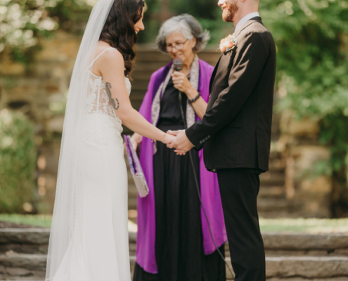 With personable and engaging wedding ceremonies, she highlights the unique stories of couples; recognizing the marvel of couples who come from all walks of life. Her ceremonies have taken place in many different settings including beautiful meadows, elegant ballrooms, warm and cozy living rooms, and even in front of the LOVE statue in center city Philadelphia. She describes herself as an attentive, happy, and calming officiant. Whether facilitating a wedding, baby blessing, or funeral/memorial service, she recognizes that each of these celebrated occasions deeply enriches not only the families and friends of her clients, but her own life too. She is profoundly honored to share in these life events.